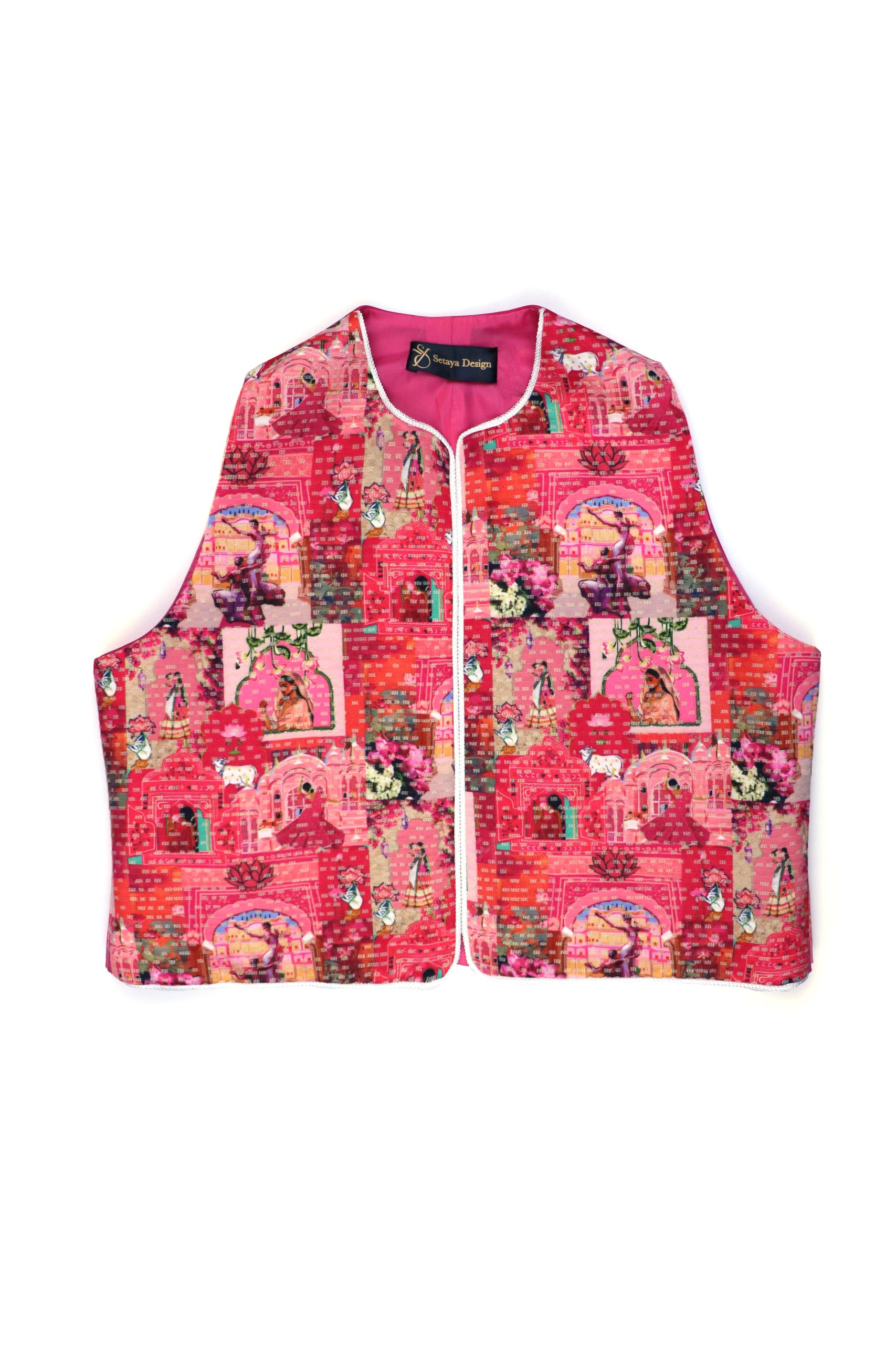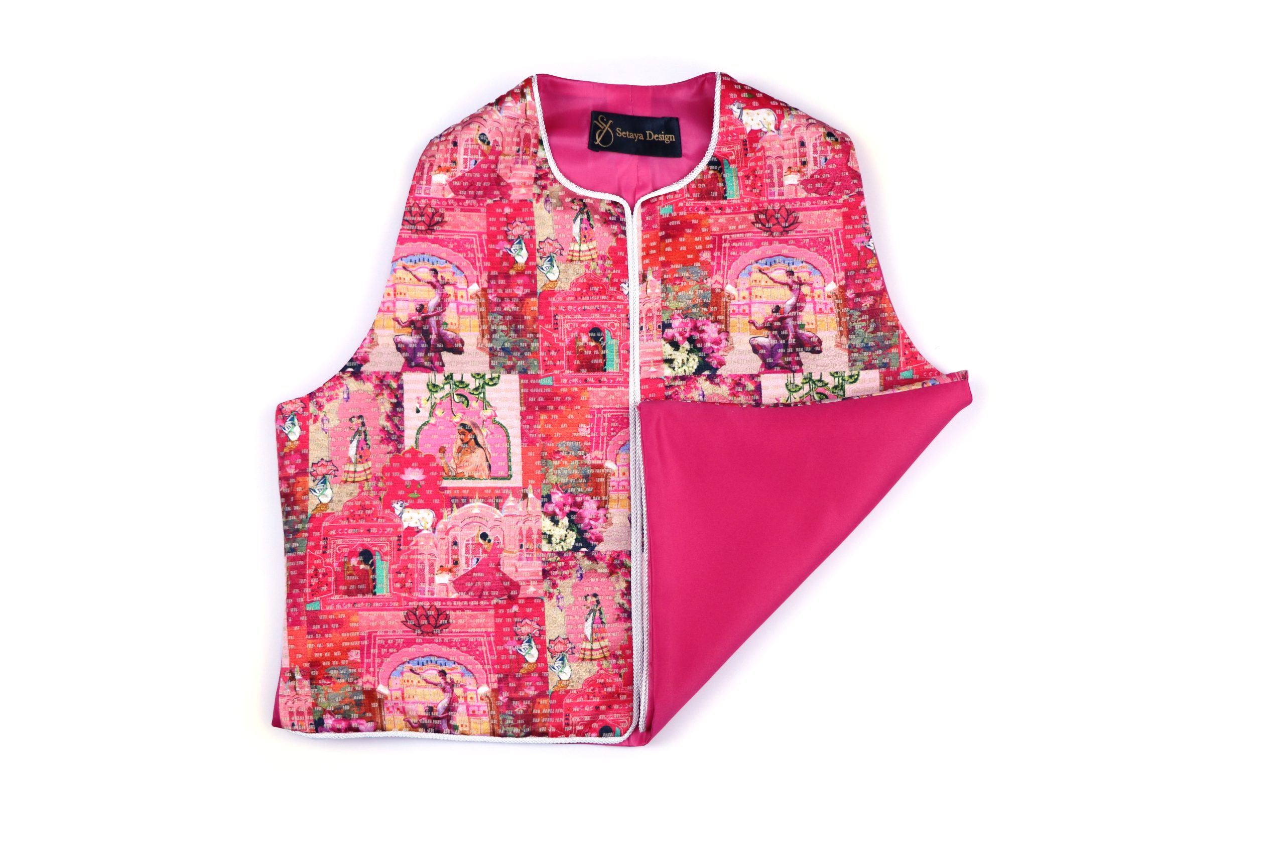 طراحی پارچه الهامگرفته از نقوش سنتی و ایرانی است.هر جلیقه جزئیات منحصربهفرد خود را دارد. هر بخش از طرح با دقت در کنار یکدیگر قرار گرفته تا هارمونی بصری حفظ شود و در عین حال، اصالت هنر دست در آن نمایان باشد.