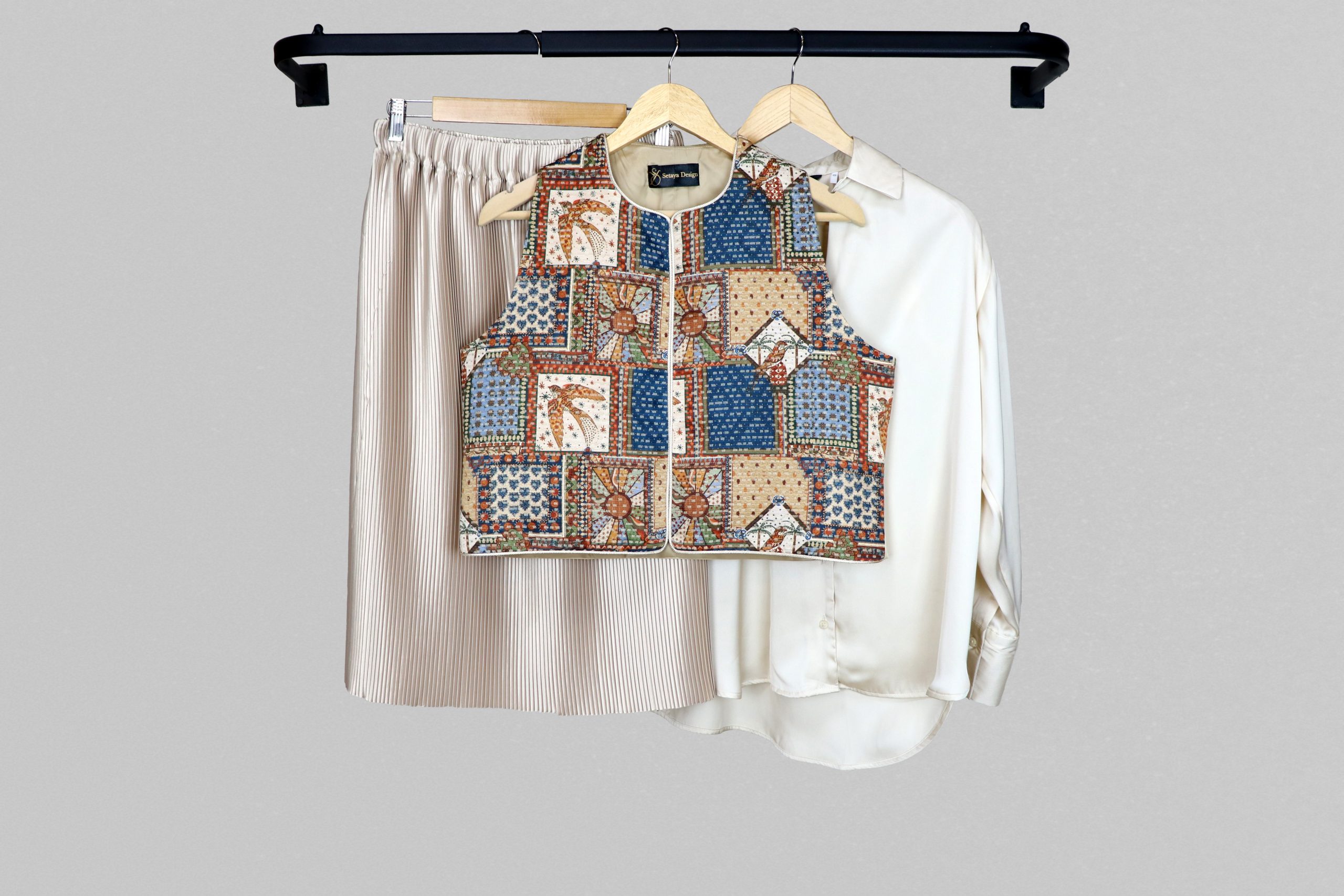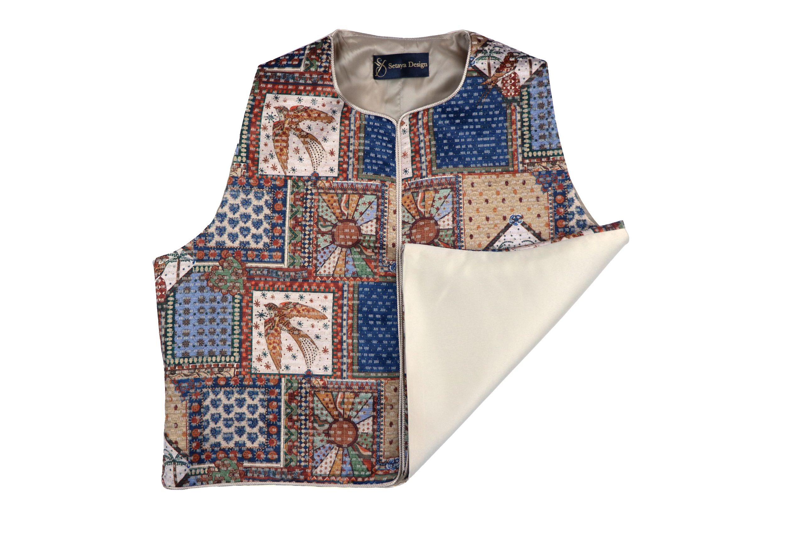 طراحی پارچه الهامگرفته از نقوش سنتی و ایرانی است.هر جلیقه جزئیات منحصربهفرد خود را دارد. هر بخش از طرح با دقت در کنار یکدیگر قرار گرفته تا هارمونی بصری حفظ شود و در عین حال، اصالت هنر دست در آن نمایان باشد.